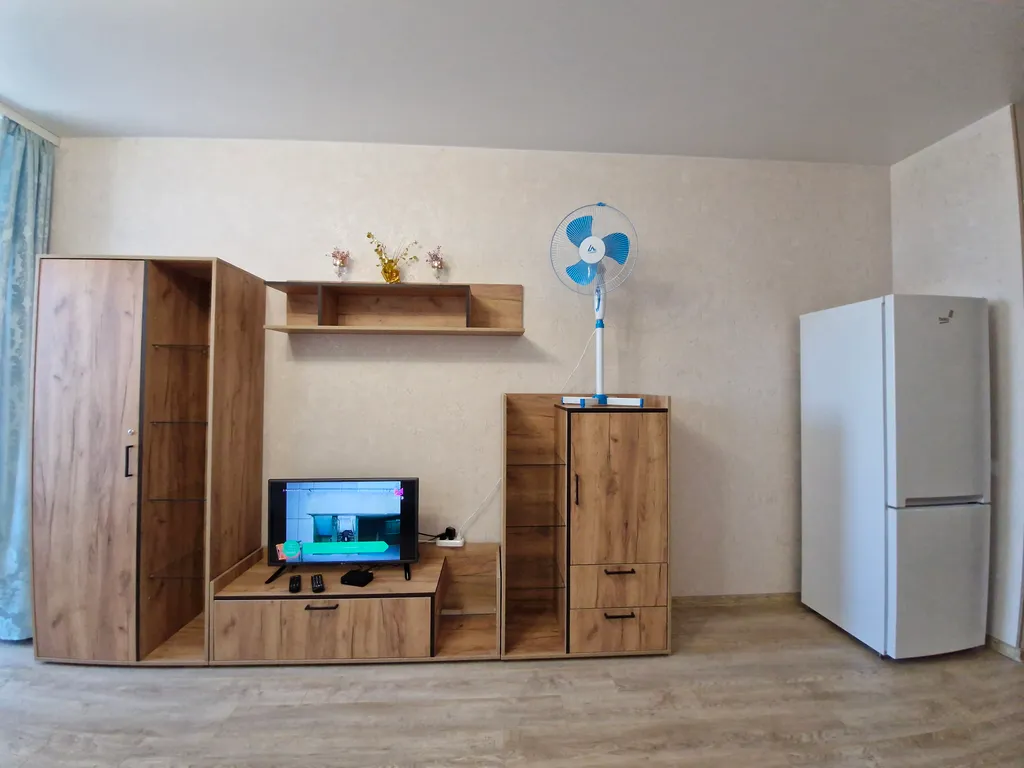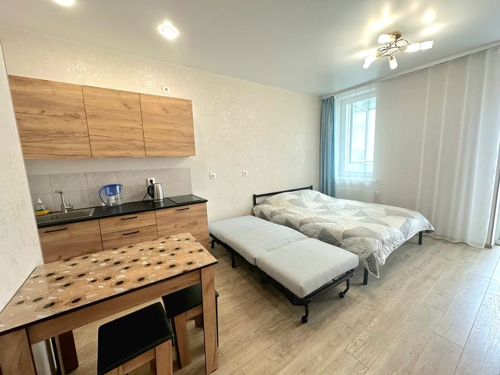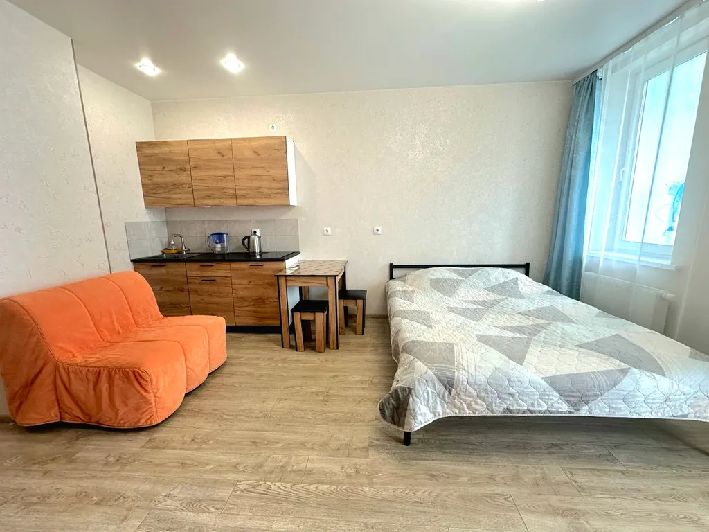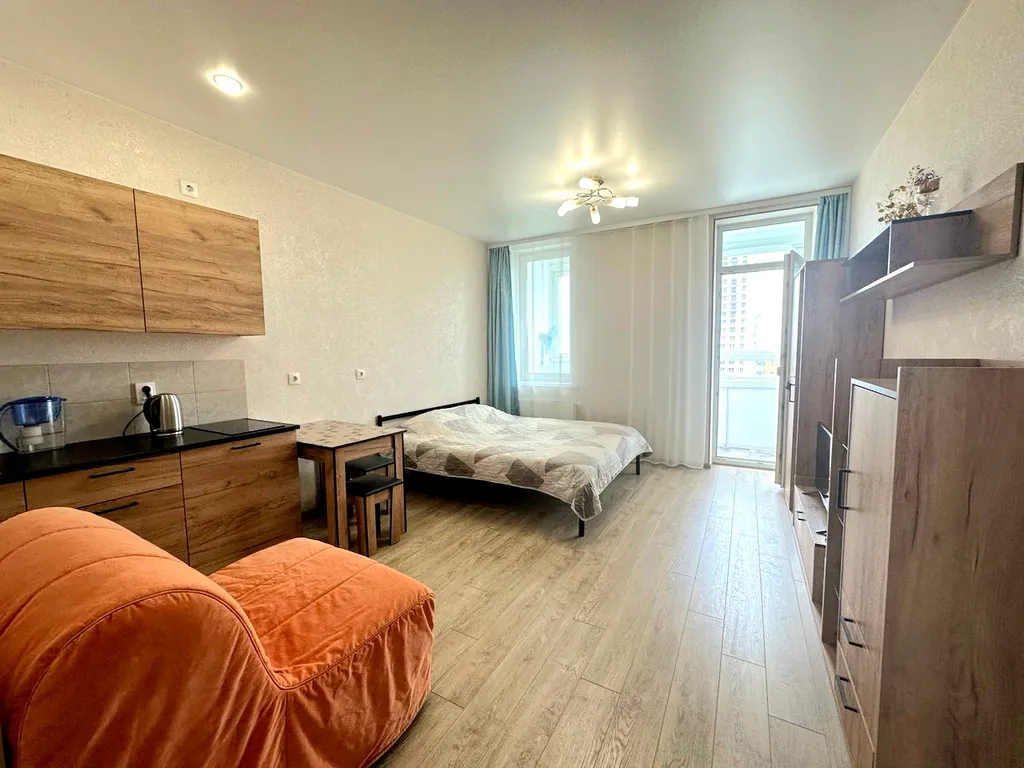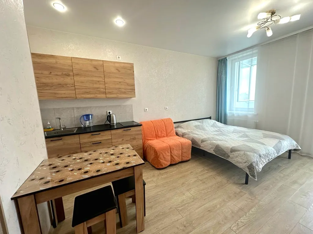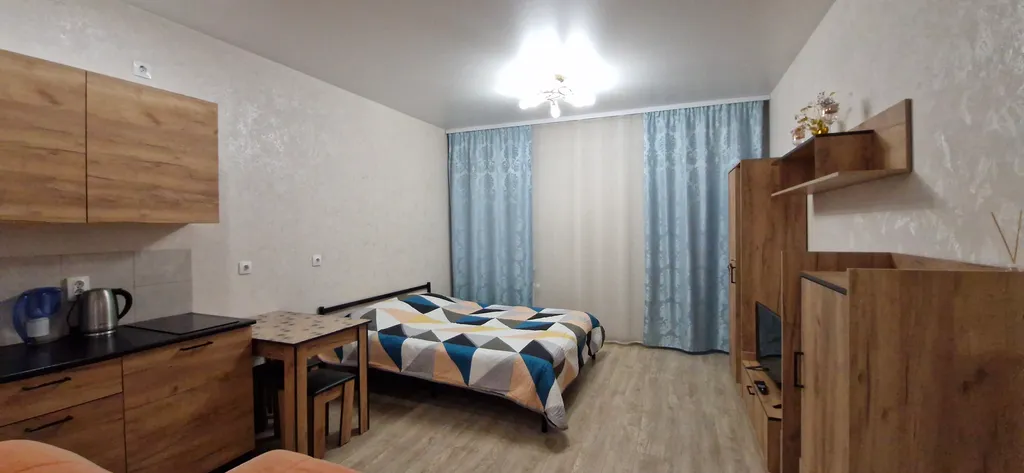 Просторная студия с кухонной зоной, рабочим местом и большим шкафом для одежды;