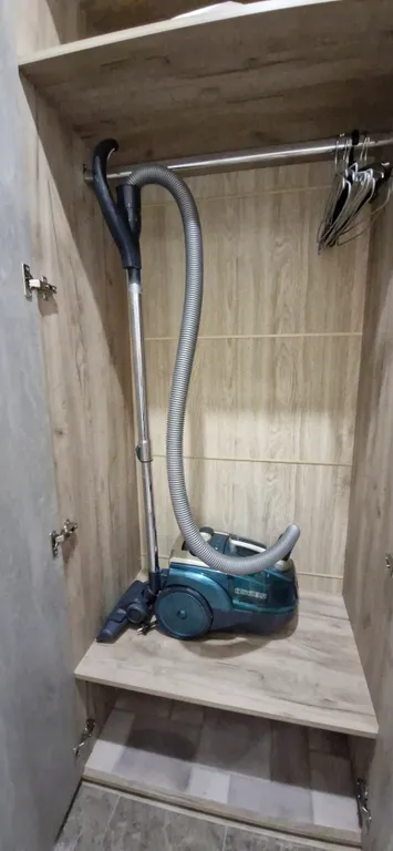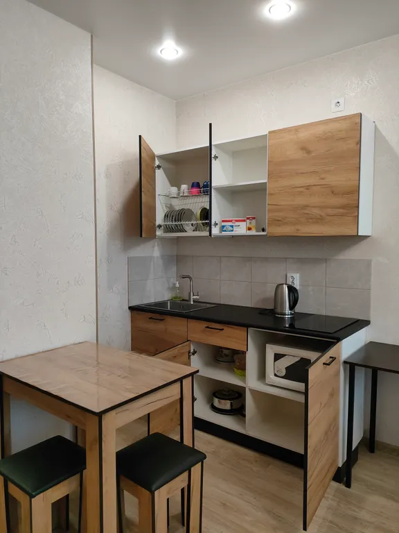 Кухня, оборудованная необходимой бытовой техникой и посудой; гладильная доска, утюг, фен.