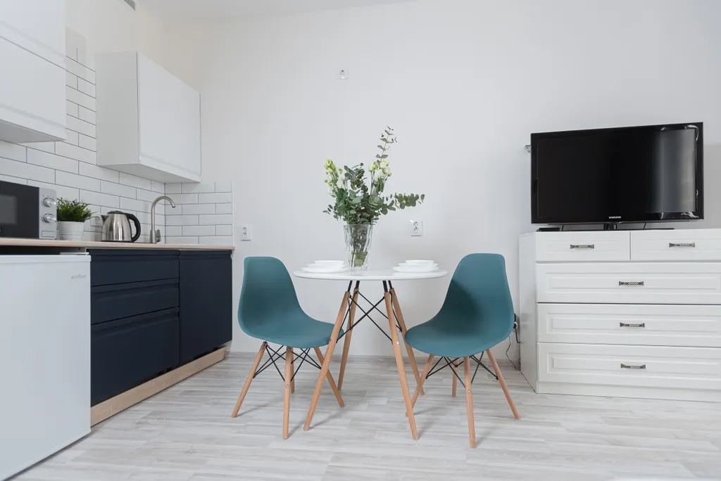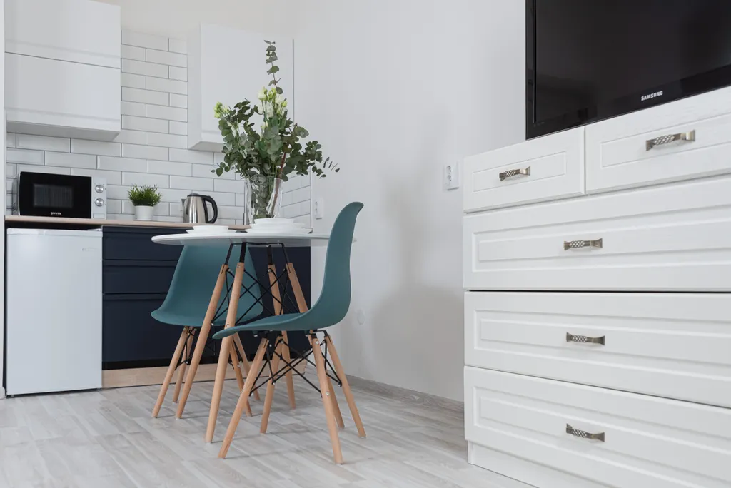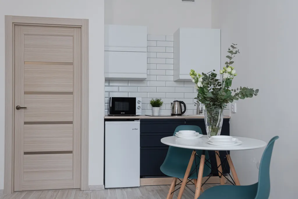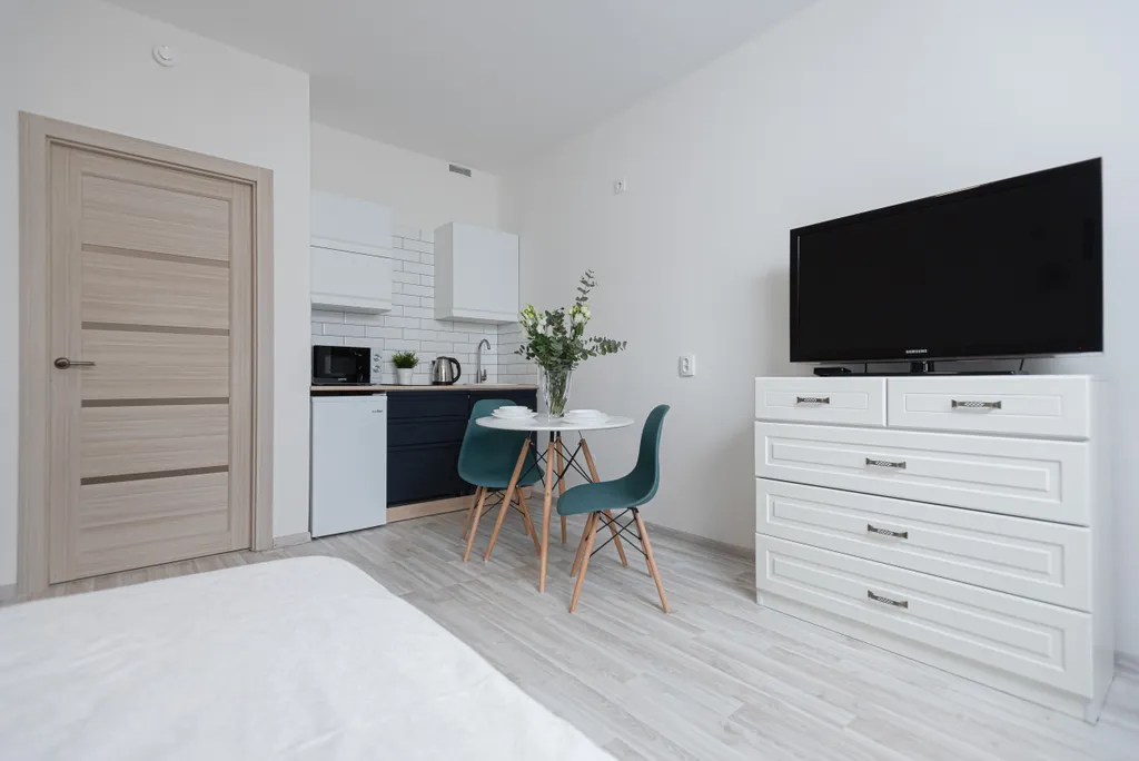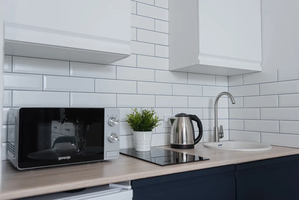• Всё необходимое для проживания: фен, утюг, стиральная машина, чайник, микроволновка и другая бытовая техника.